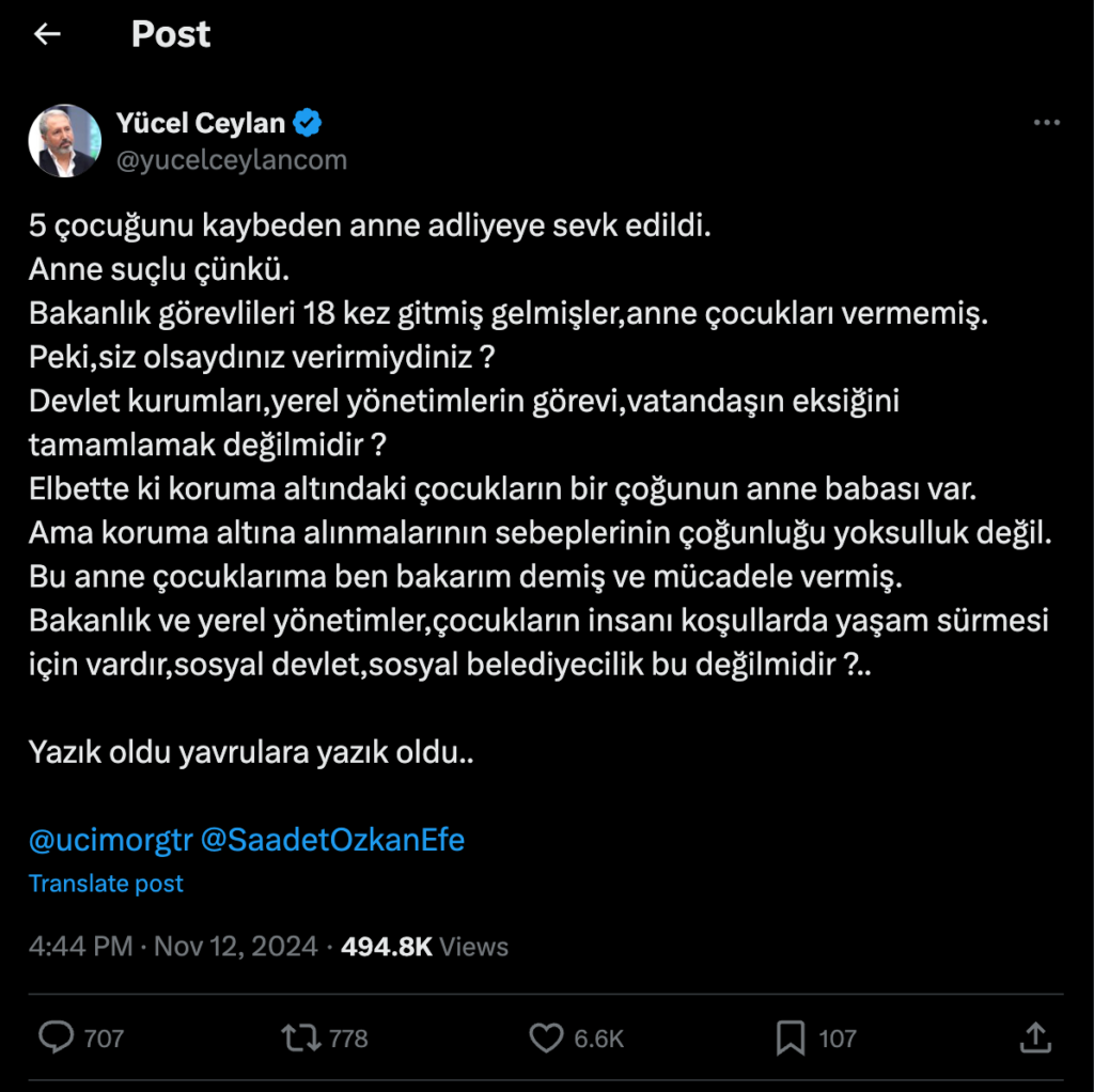“The ministry says they tried to take the children from the mother [to place them in an orphanage], but the mother did not want to give up her children. Of course, she wouldn’t want to give up her children, and if they are not being abused or mistreated, why should they leave their mother? It was the ministry’s duty to make sure they lived in humane conditions,” said activist Yücel Ceylan.