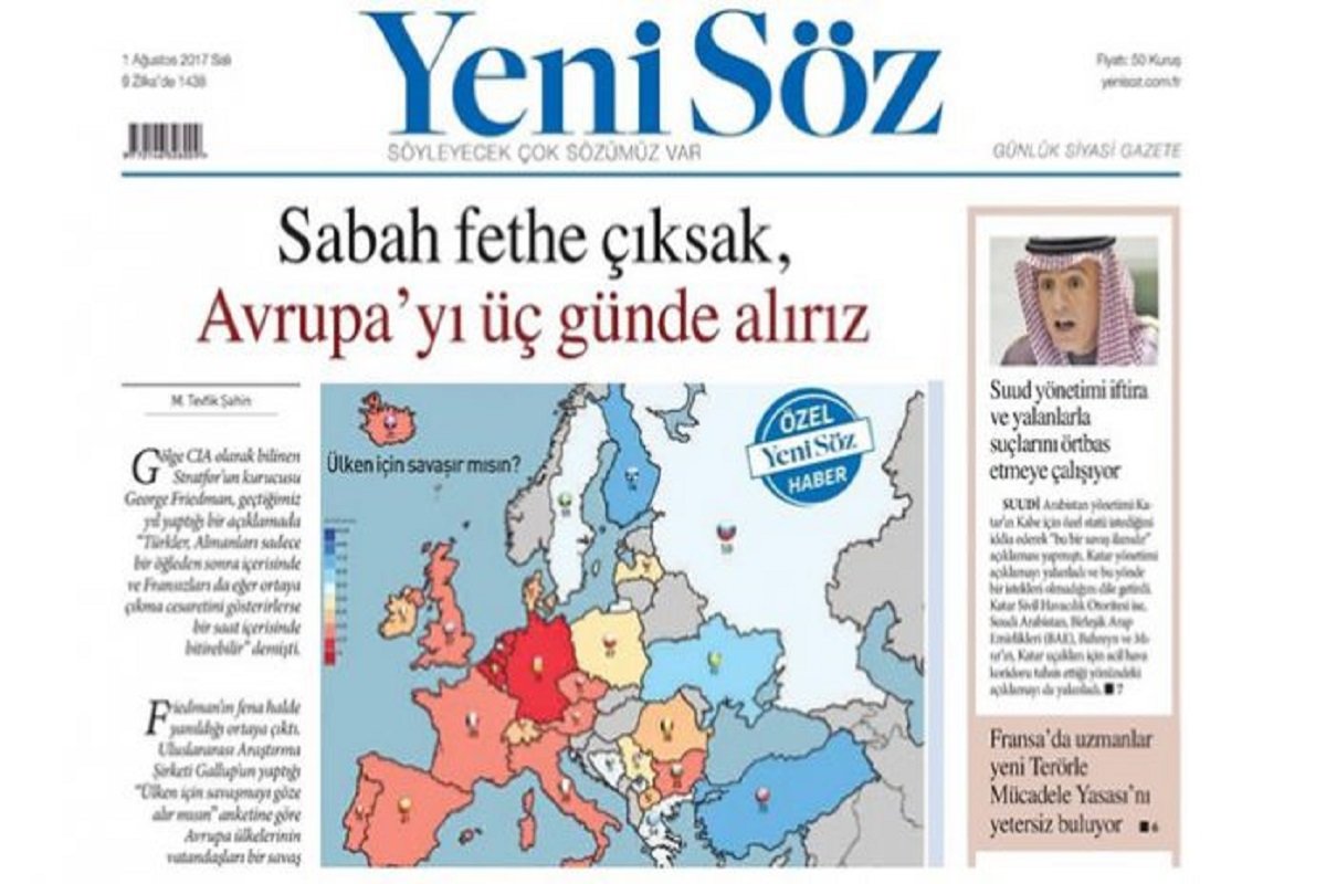 Erdoğanist Turkish daily Yeni Söz’s headline on Tuesday claimed that Turkey would conquer Europe in three days if a campaign were to be launched in the morning.