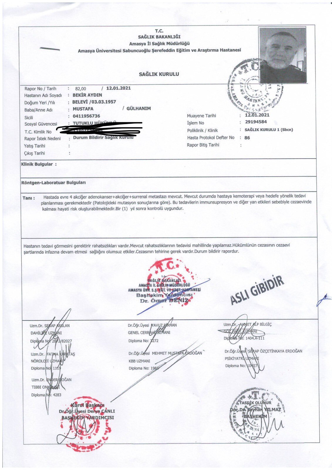 Aydın was arrested in 2016 and is currently in a prison in northern Turkey’s Amasya province. He was issued a report by a hospital saying his sentence should be postponed for a year so he could seek proper treatment. His son and lawyer, Mehmet Akif Aydın, said although he appealed to the Supreme Court of Appeals a month ago, they still had no answer.