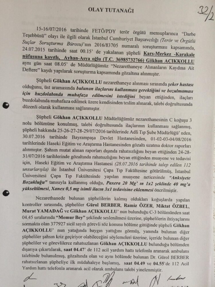 Açıkkollu, who suffered from diabetes and panic attacks, was detained on suspicion of links to the Gülen movement, a group critical of Erdogan. According to medical examinations and autopsy findings cited in legal filings, bruising and broken ribs were documented on his body. His family said his medication was not administered during detention and witnesses later told courts he had been beaten.