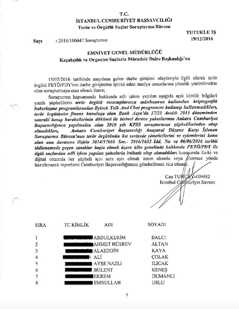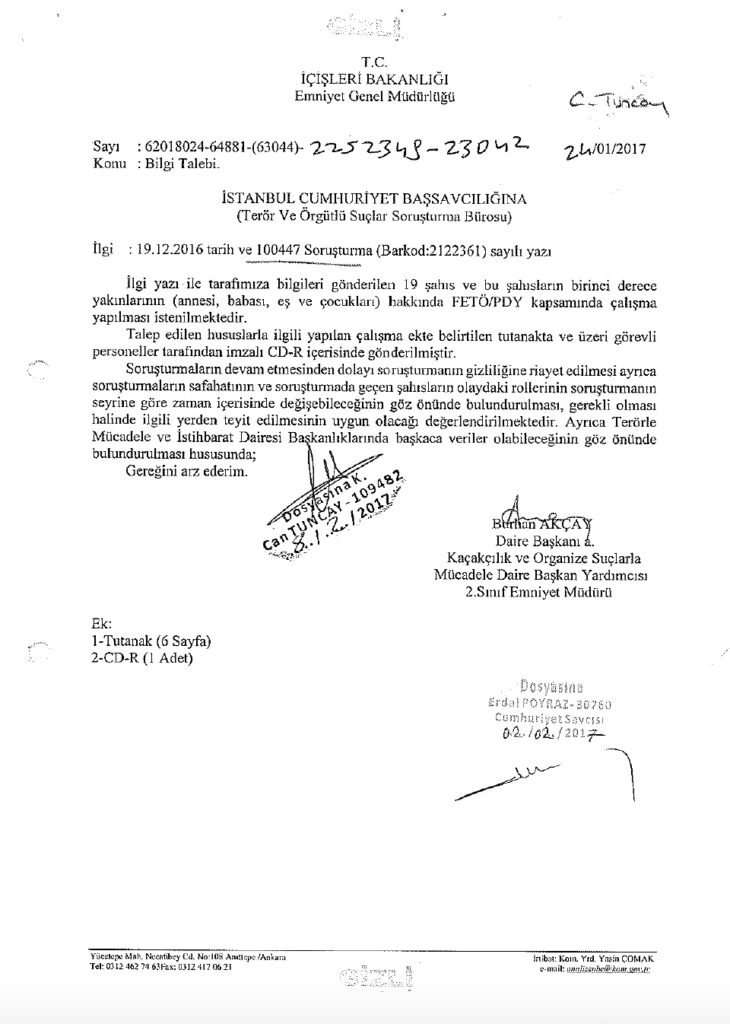 Documents showing an order by Can Tuncay requesting 19 separate investigations targeting journalists’ relatives, including parents and minor children, over criminal allegations.:
