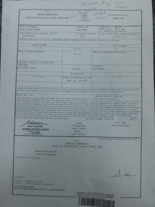 Although he died three months ago, Turkey’s Health Ministry reinstated him to his job on Feb. 21.