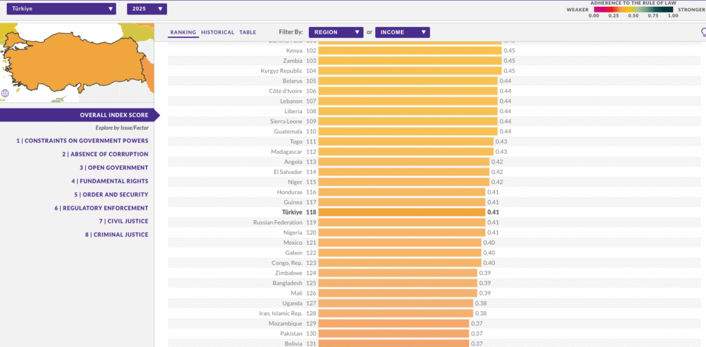 Turkey was ranked 118th among 143 countries in the 2025 “WJP Rule of Law Index” published by the World Justice Project on Wednesday, dropping one place compared to last year.