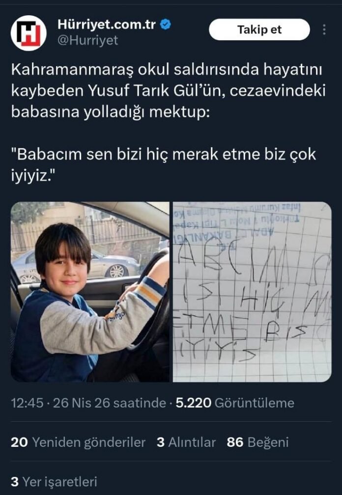 Yusuf Tarık Gül was one of nine people killed in a middle school shooting in Kahramanmaraş province on April 15. His father, former police officer Burak Gül, was dismissed from public service over alleged links to the Gülen movement after a coup attempt in 2016 and was later sentenced to more than six years in prison and released last year.